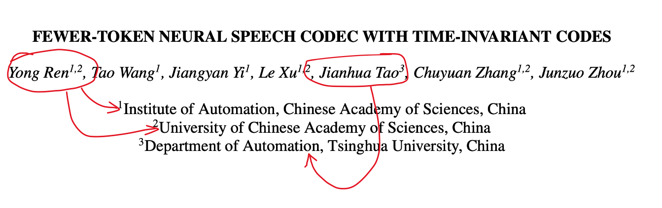 | 0 | 2310.00014 | Yong Ren | Yong Ren, Tao Wang, Jiangyan Yi, Le Xu, Jianhu... | Fewer-token Neural Speech Codec with Time-inva... | Submitted to ICASSP 2024 | None | None | None | cs.SD eess.AS | http://arxiv.org/licenses/nonexclusive-distrib... | Language model based text-to-speech (TTS) mo... | 2023-10-03 | 2310.00014v1.pdf | FEWER-TOKEN NEURAL SPEECH CODEC WITH TIME-INVA... |