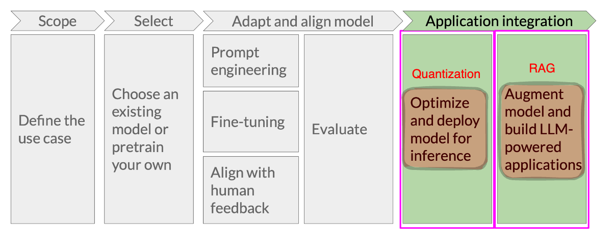 LLMs are usually deployed as a component of a larger application. This larger application can make use of external resources, such as collections of documents, or knowledge bases. Deployment must also take into account the computational resources that are available, such as the availability of GPUs and sufficient memory.